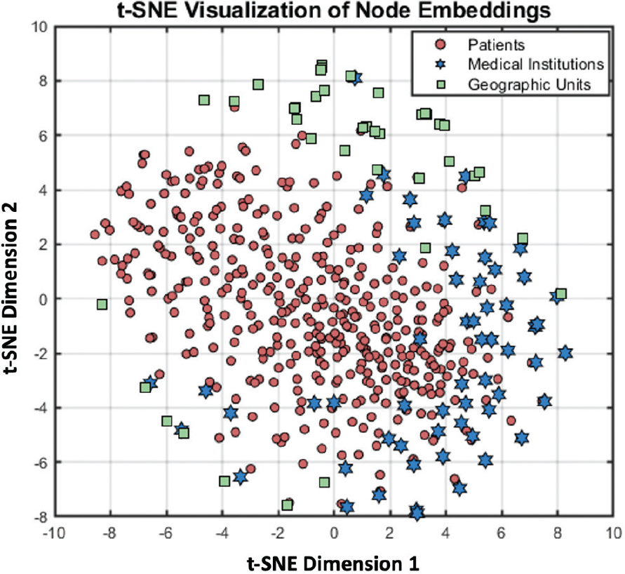 Figure 3 shows the distribution of different types of nodes in the embedding space after t-Distributed Stochastic Neighbor Embedding (t-SNE) dimensionality reduction. The X and Y axes represent the principal component dimensions extracted by t-SNE, used to preserve local structural features. The results show that the three types of nodes exhibit significant clustering, indicating that the model effectively captures structural and semantic relationships. Among them, patient nodes show the most significant clustering, while the distribution of medical institutions and geographical units is more complex. These results validate the effectiveness of heterogeneous graph models in modeling relationships among multiple types of nodes, providing a semantic foundation for subsequent path modeling and attention allocation.