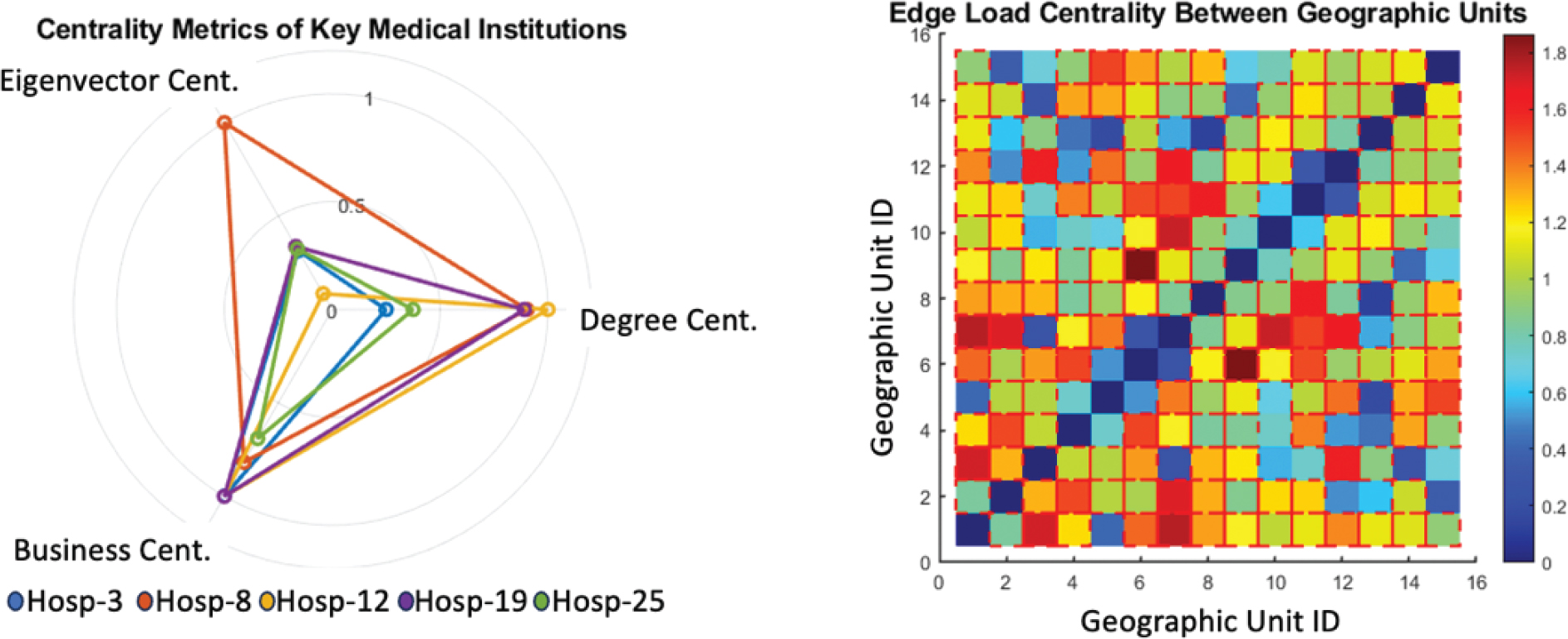 Figure 6 illustrates the identification of key institutions and spatial path pressure analysis within the healthcare service network. The radar chart on the left characterizes five major healthcare institutions using degree centrality, eigenvector centrality, and betweenness centrality. The results show that Hospitals-8 and -19 perform exceptionally well across multiple dimensions, exhibiting high connectivity and bridging capabilities. The heatmap on the right reflects the edge load between geographical units; darker colors represent higher service traffic. Units 6 and 9 show a load exceeding 0.8, forming a significant bottleneck. Overall, some institutions and paths experience high service pressure, providing a basis for regional collaborative optimization and intervention at key nodes.