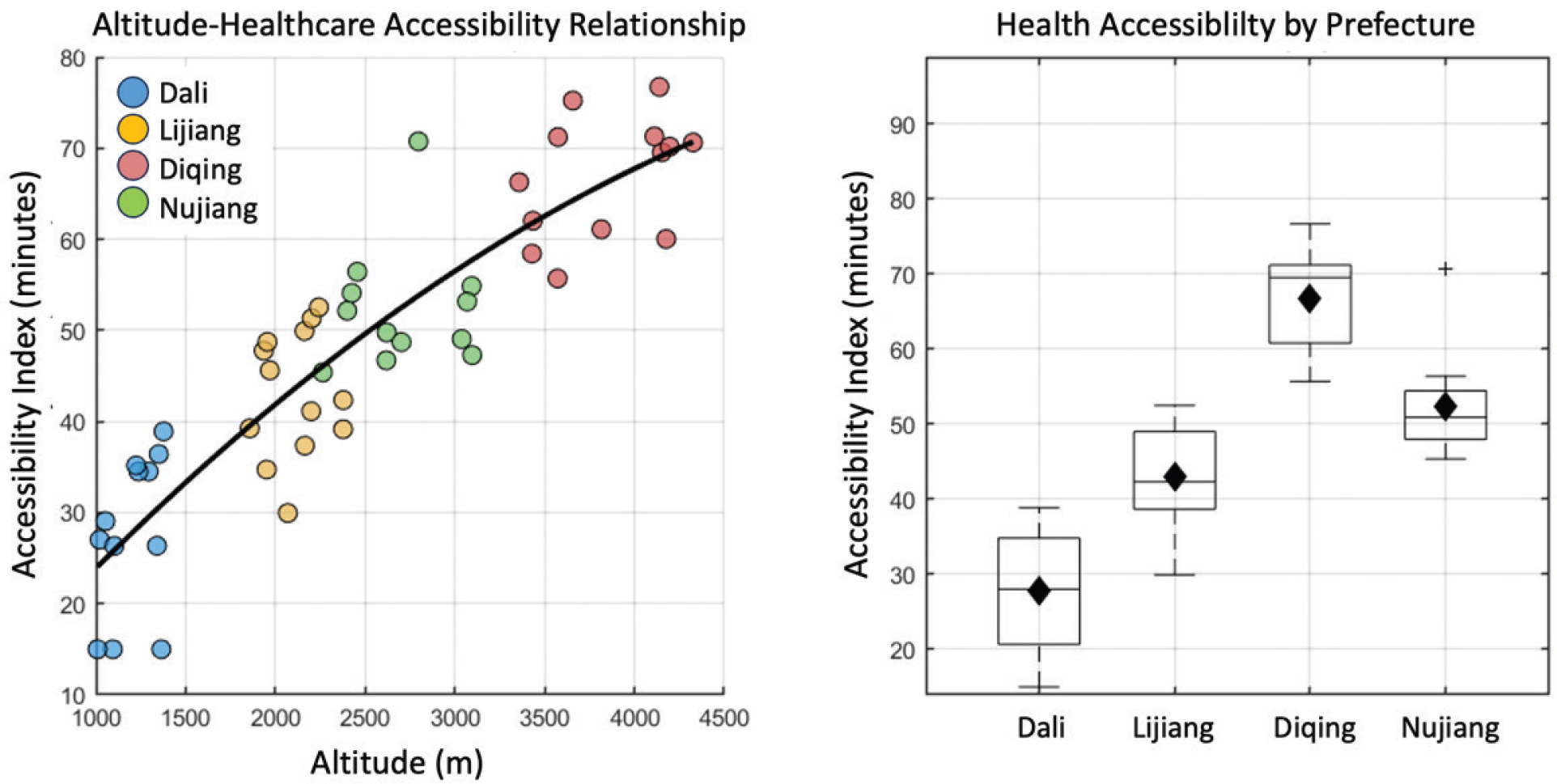 Figure 7 analyzes the access to medical services in the four prefectures of northwestern Yunnan (Dali, Lijiang, Diqing, and Nujiang) from the perspective of spatial accessibility. The X-axis of the left figure is the village altitude (meters), and the Y-axis is the accessibility index (unit: minutes). In Diqing (approximately 3,600 ± 400 meters above sea level) and Nujiang (with an average altitude of about 2,700 meters), the time it takes to receive medical services is significantly higher than in low-altitude areas, such as Dali, indicating that patients in plateau areas face more pronounced transportation obstacles. The right figure is a box plot of medical accessibility in each state, with the Y-axis representing access time. It can be seen that the average accessibility index of Diqing is as high as 68 min, which is much higher than Dali’s 29 min, and its internal differences are also greater. Figure 8 quantitatively reveals the uneven impact of regional geographical differences on medical accessibility, providing intuitive evidence for understanding the problem of primary medical accessibility in border multiethnic areas.